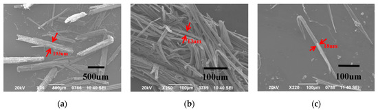 As illustrated in Figure 3, the surface of the raw AP was very rough, and large number of gum materials were attached to it. During the production of AMF, a large number of colloids, e.g., pectin, lignin, and hemicellulose, were removed through the treatment, and many finer fibers were obtained (Figure 3b). The NaOH boiling separated the raw fibers and shortened them. To determine the length and fineness of AMF, 100 single fibers were randomly selected and measured under an optical microscope. The dates of length, diameter, and aspect ratio of micro- and nano-fibers are shown in Table 2. Most fibers had lengths between 600–1000 μm. The averages of the length and diameter of the fibers were 850.6 ± 119.1 μm and 14.3 ± 1.9 μm, respectively. The aspect ratio was about 60. Although it is too short for the traditional textile industry, the fiber is very suitable for making nanocellulose. The cost and difficulty of micron size to nanometer size is greatly reduced with this fiber length. The larger aspect ratio could provide a large specific surface area, which could improve the reinforcing effect for polymer composite application [24].