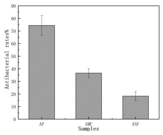 According to Chinese National Standard (Evaluation of antibacterial properties of textiles) (GB/T 20944), an oscillating method was used to determine the antibacterial properties of raw bast, AMF and ANF. Cotton fiber without antibacterial activity was selected as the control. The selected strain was Escherichia coli, and all samples and equipment were subjected to high-temperature and high-pressure sterilization before use. Two parallel samples were tested of each type of material. The formula for calculating the bacteriostatic rate is