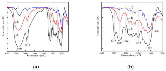 The FTIR spectra (a) of (A) Artemisia vulgaris bast powder; (B) Artemisia vulgaris bast microcellulose fiber, and (C) Artemisia vulgaris bast nanocellulose fiber. (b) A clearer view of peak changes in the 750–2000 cm−1 range.