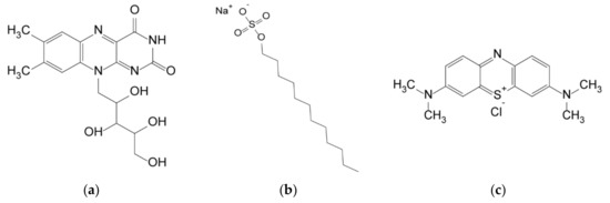 Chemical formula of the three pollutants tested: (a) riboflavin; (b) SDS; (c) methylene blue.
