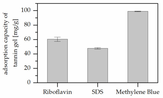 A positive effect of the lignin was observed when compared to the results for adsorption by tannin based polymers in the literature. Similar materials adsorbed roughly 45 mg methylene blue per gram adsorbent and 22 mg SDS per gram of the tannin polymer [21]. The results also exceeded the adsorption capacity of other agricultural by-products like hazelnut shells [43] or spruce wood [7]. However, as soon as the adsorbents are specifically designed for the removal of pollutants, the absorptions skyrocket (e.g., 200 mg/g for the simultaneous removal of methylene blue and oil by polymer membranes [10] or lignin derived activated carbons with 550 mg/g [44]).