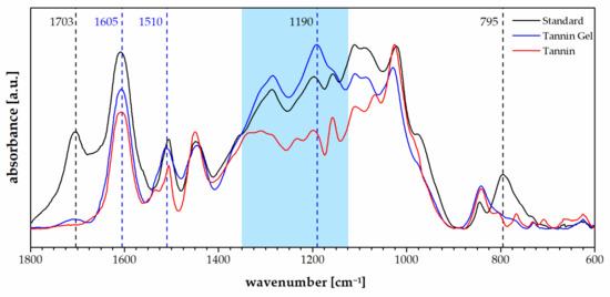 The spectra of the tannin gel presented a similar profile to the standard foam except for a decrease in the signals typically due to the furanic moieties like the carbonyl group at 1703 cm−1 and the signal at 795 cm−1, which were attributed to furanic C–H bending (out-of-plane) [46]. The tannin gel also presented a very different profile to the tannin powder and particularly, a higher absorption at 1605 and 1510 cm−1, which suggests increased aromatic contribution as well as a general increase in the region between 1350 and 1100 cm−1, which is dominated by Carom–O vibrations [47]. The band at 1190 cm−1, which was higher for the tannin gel than for the foam, and the tannin powder could be attributed to the interflavonoid vibrations [48].