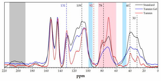 Solid-state 13C-NMR spectra of the standard foam (black), the tannin acidified gel (blue), and the tannin extract (red).