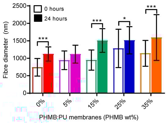 Fibre diameters (nm) of electrospun PHMB:PU membranes. Samples included untreated membranes (0 h) and membranes after immersion in PBS for 24 h. N = 20–50, taken from three different areas of material imaged with SEM. Error bars describe the standard deviation from the mean. * signifies a significant percentage change after immersing samples in PBS (* for p < 0.05; *** for p < 0.0001).