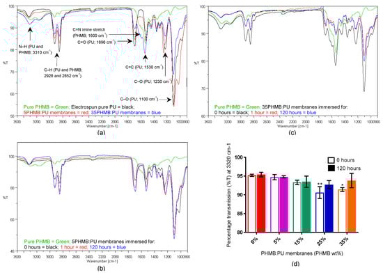 The FTIR spectra for electrospun PHMB:PU membranes had characteristic absorption peaks for PU (functional groups of N–H, C–H, aromatic C=C and ester groups C=O and C–O at wavelengths of 3320, 2928 and 2852, 1530, 1696, 1230 and 1100 cm−1 respectively [25]) and PHMB (functional groups of C=N, N–H and C–H with wavelengths of 1600 cm−1 [stretch], 3310 cm−1, 2928 and 2852 cm−1 respectively [35]), see Figure 3a–c. Percentage transmission at these wavelengths exhibited a trend of PHMB influence on PU peaks as PHMB levels increased (Figure 3). In particular, the stretch corresponding to PHMB’s imine group became more pronounced as PHMB concentration increased (Figure 3a–c). The amine peak (N–H) characteristic of PU and PHMB also had a dampened percentage transmission with the addition of PHMB (Figure 3a–c), significantly decreasing for 25- and 35PHMB:PU membranes before PBS immersion (Figure 3d, 0 h). This is likely related to a secondary peak forming at around 3150 cm−1 with higher PHMB concentrations, corresponding to PHMB’s primary amine groups as opposed to PU which only has secondary amine groups.