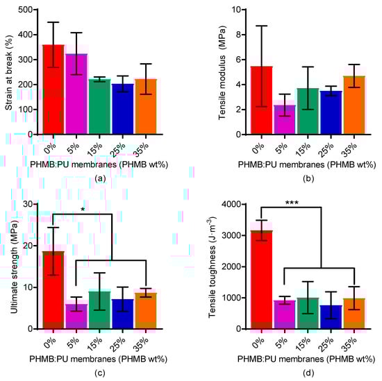 The overall tensile mechanical properties of PHMB:PU membranes, in terms of the strain at break, elastic modulus, ultimate strength and toughness, were reduced in the presence of PHMB, compared to pure PU electrospun membranes (0PHMB:PU), as shown in Figure 4. In particular, the ultimate strength and tensile toughness of PHMB:PU electrospun membranes were seen to decrease significantly by an average of 58.65% and 70.95% respectively when compared to electrospun PU only membranes (Figure 4c,d, p < 0.05 and p < 0.001 respectively). However, this trend did not reflect the increasing load of PHMB to electrospun PU membranes as no significance was recorded between 5-35PHMB:PU membranes.