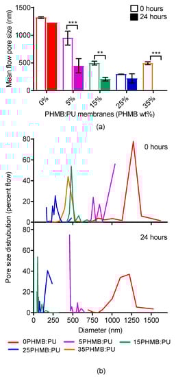 Pore size and distribution were evaluated to access the breathability and permeability of membranes. As the content of PHMB increased, the pore size of the membranes reduced drastically, but were not fully exhausted (significant differences recorded between 0-, 5- and 15-35PHMB:PU membranes, Figure 5). After the PHMB:PU membranes were immersed for 24 h in PBS, pore size decreased further with 35PHMB:PU membranes becoming impermeable.