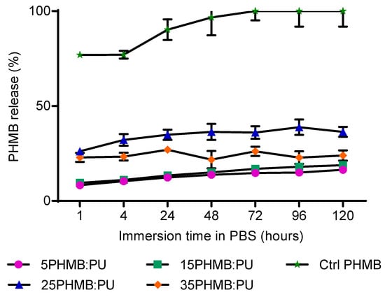 Average percentage release of PHMB from electrospun PHMB:PU membranes after immersion in PBS. Error bars describe the standard deviation from the mean, with n = 3. Paper disks freely infused with PHMB (Ctrl PHMB) were used as controls, as described in the methods section.