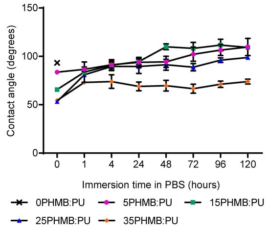 The contact angle change of electrospun PHMB:PU membranes after immersion in PBS. Changes in contact angle inversely indicate changes in wettability as PHMB was released. Error bars describe the standard deviation from the mean, with n = 3. 0 h measurements for 35PHMB:PU membranes were taken but were found to give unstable droplet formation, indicating higher hydrophilicity than reported.