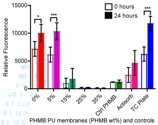 Alamar blue assays were used to assess the toxicity of PHMB:PU electrospun membranes against cultured human keratinocytes via metabolic activity. 5PHMB:PU electrospun membranes showed no cell toxicity at all time points (Figure 9). The same was seen for pure PU only electrospun membranes, displaying the non-toxic nature of PU. After 24 h of incubation with samples, the cell viability levels of 15PHMB:PU membranes were not significantly different to the commercial product Actisorb Silver 220 or the non-electrospun PHMB control groups, all of which showed a significant amount of cell toxicity (Figure 9, p < 0.05). However, after 48 h, Actisorb Silver 220 showed slight but significant improvements in cell viability, while 15PHMB:PU membranes did not. Finally, 25- and 35PHMB:PU electrospun membranes showed high levels of toxicity that were not recoverable during the monitoring period.