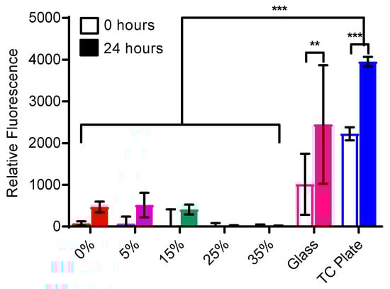 HaCaT cell metabolic activity on PHMB:PU membranes. Cell metabolic activity after 24 and 48 h using the Alamar blue assay on membranes which had been immersed in cell culture media overnight before cell seeding to mimic attachment after use in vivo. Tissue culture plate (TC plate) and glass were used as controls. Error bars describe the standard deviation from the mean, with n = 3. * indicates a significant difference (** for p < 0.001; *** for p < 0.0001).