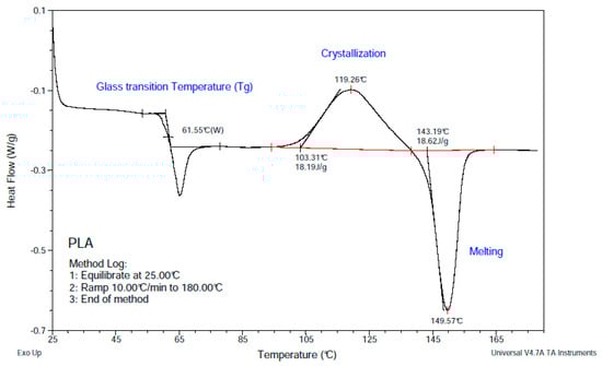 The thermal properties of PLA samples (7.01 mg) were measured by Differential Scanning Calorimetry (DSC; TA-Q2000, Lukens Drive, New Castle, PA, USA). The melting point (Tm), glass-transition temperature (Tg), and cold crystallization was measured from 25 to 180 °C under nitrogen in aluminum capsules at heating rate of 10 °C/min.