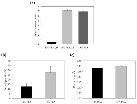 Afterward, both structures were visualized by SEM to study the microscopic structure (Table 4). The uniformity of the fibers was confirmed through the visualization of the bottom and top sides. Scaffolds from 12% PLA showed two different types of filaments. One of them showed a diameter of roughly 7 µm, whereas the second type exhibited fibers nearly 20 times thinner. In contrast, 15% PLA scaffolds presented one filament population, lacking the slight ones (Figure 3). Both sides’ images from the lower PLA-concentration meshes revealed the possible presence of beads; this was not found in the higher PLA percentage on any side. Non-significant differences regarding the pore area or surface porosity were found between the two polymer concentrations, although it was observed that 15% PLA scaffolds had a non-significant higher surface porosity compared to 12% PLA scaffolds (Figure 3).