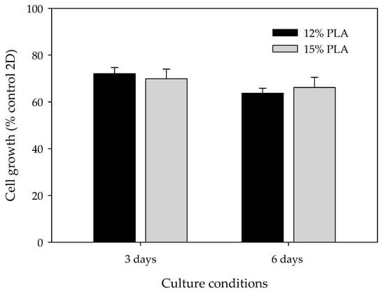 Differences among microscopic features due to the percentage of PLA used may influence cell adhesion and growth. Therefore, cell viability assays were performed to ascertain whether MDA-MB-231 cells can be cultured using ES-PLA scaffolds and determine the optimal PLA concentration (Figure 4). Two culture periods were chosen, i.e., three and six days. As expected, cells cultured in 3D presented a lower proliferation rate than cells growing in a monolayer. Accordingly, these differences were more noticeable after six days. Nonetheless, cell growth was surprisingly high in both 12% and 15% PLA scaffolds, with no significant differences in any of the times assayed. Henceforth, the experiments were carried out using the non-beading 15% concentration PLA meshes.