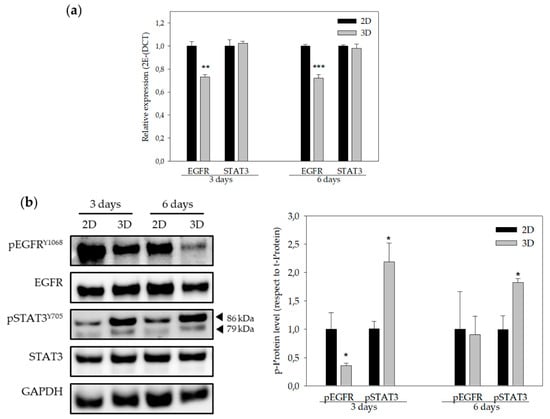 Previous investigations have demonstrated that EGFR gene expression, as well as STAT3 and EGFR protein activation, was altered in 3D-cultured cells [,]. For this reason, EGFR and STAT3 gene and protein levels were assessed by quantitative real time PCR and Western blotting (Figure 5). As expected, EGFR gene expression levels were significantly lower in 3D-cultured cells compared to cells cultured in monolayer. However, no changes in STAT3 gene expression were visualized in the three or six day cultures when comparing 2D and 3D cultures (Figure 5a). Furthermore, EGFR protein phosphorylation levels were decreased, whereas phosphorylation levels of STAT3 increased in 3D culture conditions, both in three and six day cultures (Figure 5b).
