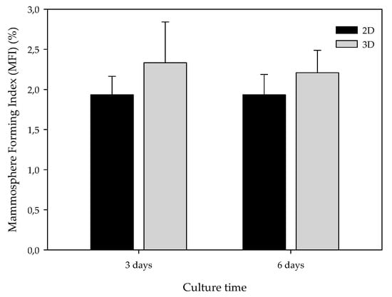 The BCSC population also exhibits the capability to grow in non-adherent surfaces, proliferating into suspension spheres called mammospheres []. Taking advantage of this capability, the mammosphere-forming (MF) assay was performed in cells previously cultured in monolayer and 15% ES-PLA meshes. Different cell culture periods, three and six days, were also assessed. As exhibited in Figure 6 monolayer-cultured cells displayed MFI values close to 2% in both culture periods. In contrast, cells from 3D cultures showed a slightly higher MF capacity compared with its correspondent 2D control, although no significant differences were found. This trend was found in both culture days tested.