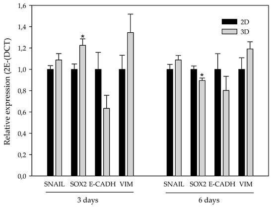 Regarding EMT-related genes, the transcription factor Snail and the mesenchymal protein Vim presented a subtle trend to be upregulated in 3D-cultured cells with no significance. In addition, the observed tendency of Vim was higher after three days. In contrast, the expression of the epithelial protein E-cadh presented a non-significant decrease when comparing 3D-cultured cells with the monolayer culture. Again, the aforementioned decrease also exhibited a stronger trend after three days of culturing. Sox2 was significantly upregulated on cells cultured in scaffolds over three days, whereas it presented a downregulation at six days of culture.