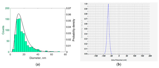 The electrophoretic mobility of the cellulose nanofibrils was −5.6 × 10−8 m2V−1s−1, which corresponded to the apparent mean zeta potential of −69.7 mV. The reconstructed zeta potential distribution is shown in Figure 2b. Despite the inherent inaccuracy of the zeta potential reconstruction by the Smoluchowski equation (in the approximation of spherical particles), the estimated zeta potential value reflected the considerable negative charge of the cellulose nanofibrils. Indeed, the cellulose nanofibril dispersion was rather stable and showed only minor sedimentation after several weeks of storage, while gentle shaking restored the homogeneity of the dispersion.