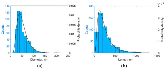 The fraction of halloysite nanotubes visualized by TEM micrographs was characterized by length and diameter distributions. Both length and diameter were well described by lognormal distribution with the parameters µ = 3.8734 and σ = 0.4390 for diameter, and µ = 5.3164 and σ = 0.6910 for length. The histograms and the fitted distributions are shown in Figure 4.