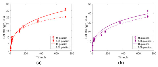 where s is gel strength, t is time, and a1–a3 are fitted parameters. The model reflects the rapid onset of the gel strength after the gelation time and the slow growth of the gel strength during its ripening. In Figure 5, the lines are Equation (1) fits that approximate the experimental points. The fitted parameters for Equation (1) are listed in Table A1 in Appendix A.