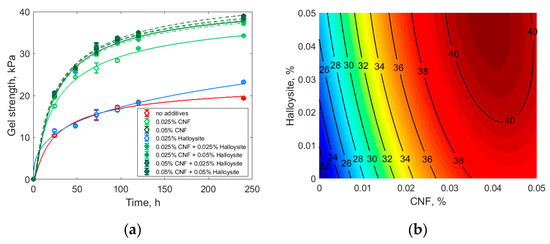 (a) Silica gelation with various additives. Lines are Gompertz model fits. (b) Gel strength at 240 h (showed by isolines, kPa) as a function of cellulose nanofibrils and halloysite added. CNF: cellulose nanofibrils.