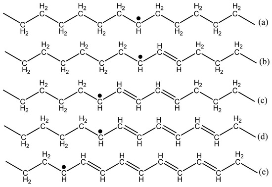 Free radicals expected from the irradiation of polyethylene. Schematic drawing of the (a) alkyl, (b) allyl, (c) dienyl, (d) trienyl, and (e) tetraenyl free radicals.
