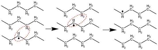 Crosslinking in the crystalline region of the polymer is not favored because the spacing between the chains (4.1 Å) is longer than the carbon–carbon bond length (1.5 Å) [13]. In the crystalline region of the polymer, alkyl free radicals are expected to migrate to the crystal surface, where crosslinks can be formed. The primary mechanism by which the radicals can migrate within the crystal is a set of successive inter or intra-molecular hydrogen abstraction reactions, which is also known as hydrogen hopping [14,15,16,17,18]. Through this mechanism, a radical site on a macromolecule abstracts a hydrogen atom from an adjacent carbon atom (either on the same chain or a nearby chain). This process can repeat itself, another hydrogen can be abstracted, and the radical can move once again to a new location, and so on. Figure 2 shows the first step in this hydrogen hopping mechanism [19].