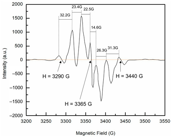 Electron paramagnetic resonance (EPR) spectra of ultra-high molar mass polyethylene (UHMMPE) fibers irradiated to approximately 25 kGy in the electron beam. The first derivative is a septet attributed to the combination of allyl and alkyl radicals in the sample. The separation between the lines is shown including the magnetic field positions of the first and seventh line, H = 3290 G and H = 3440 G respectively, as well as the center of resonance H = 3365 G.