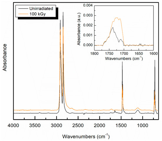 The complete FTIR spectra of unirradiated and gamma irradiated UHMMPE fibers at 100 kGy; inset shows the region in which oxidation would be expected; the two IR spectra have been slightly offset to allow a clearer presentation.