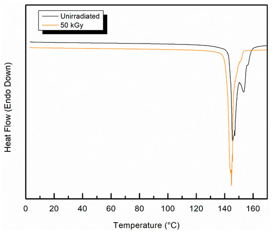 Representative DSC thermograms for the first melting of the sample irradiated at 50 kGy using gamma irradiation overlaid with a thermogram of the first melting of an unirradiated sample, are shown in Figure 6. All samples tested exhibited broad and complex melting peaks due to a phase transformation of the crystal from the orthorhombic to the hexagonal phase, which is characteristic of this material, and has been extensively reported elsewhere [39,40,41]. The primary melting peak at 149 °C, which is typically indicative of the melting of the orthorhombic crystal phase, was still present after irradiation [42]. However, minor changes are observed in the thermogram. The sample exhibited a lower onset of melting temperature, a narrower melting peak, and a near elimination of the minor, higher temperature, melting peak. The percent crystallinity was unchanged with irradiation, estimated at 91% for the unirradiated fiber and 90% for the irradiated fiber. This difference is within the error of the measurement.