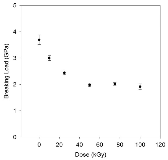 Breaking strength vs. dose for the gamma irradiated fibers are presented in Figure 8, and breaking elongation followed a similar trend. This reduction in strength is attributed to the scission of TTMs in the fiber during irradiation. At doses exceeding 50 kGy, the reduction was diminished, indicating that most of the available sites for scission appear to have been exhausted.