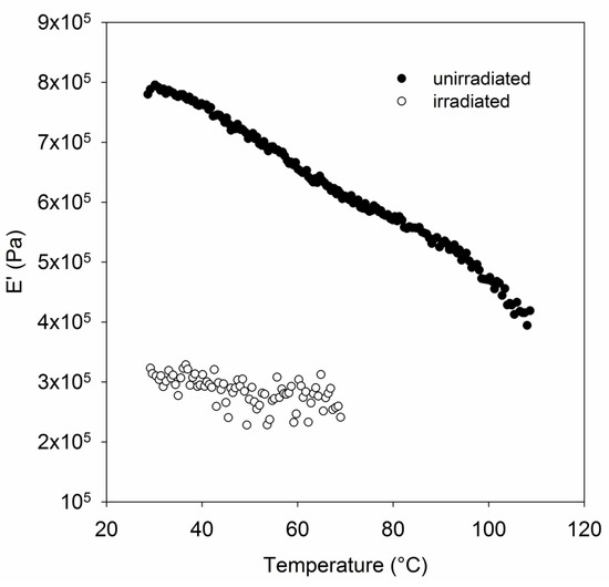 Dynamic mechanical thermal analysis (DMTA) temperature–frequency sweep of irradiated and unirradiated UHMMPE fiber.