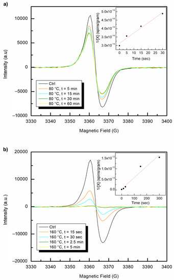Once it was clear that the polyenyl radicals remained at temperatures above the alpha-relaxation temperature, the oil bath was further heated to 165 °C, well above the expected melting temperature for this polyethylene sample [28]. The fibers started to melt immediately but remained in the same position within the EPR tube. The sample was removed from the bath and the EPR signal was remeasured after 15, 30, 150, and 300 s intervals. There were immediate and clear differences in the intensity of the polyenyl radical signal, as shown in Figure 10. The polyenyl radical signal completely disappeared after 2.5 min at 165 °C. To confirm these results, the experiment was conducted thrice using samples of the 50 kGy gamma irradiated polyethylene fibers. In all cases, the polyenyl radicals were eliminated rapidly upon heating above the melting temperature. The decay of carbon centered polyenyl free radicals at both temperatures revealed second order kinetics, as can be seen from the inset graphs shown in Figure 11. This finding was expected since these carbon centered radicals, when under inert conditions, can be eliminated by a radical–radical bimolecular recombination reaction, which is a well-known second order reaction. Finally, the observed reaction rate constant (kobs) of the recombination reaction, calculated by the slope, was by an order of magnitude greater at 165 °C (slope value = 5.38 × 10−15 or kobs = 8.63 × 10−36 mol L−1 s−1) as compared to the 80 °C (slope value = 6.04 × 10−16 or kobs = 9.73 × 10−37 mol L−1 s−1). This result is expected since the mobility of the polymer chains and C-centered radicals in the melt is much greater.