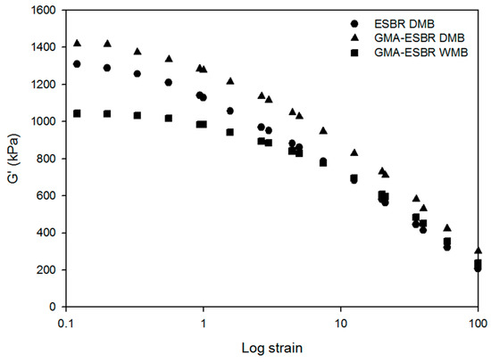 Storage modulus as a function of strain for the ESBR DMB, GMA-ESBR DMB, and GMA-ESBR WMB compounds.