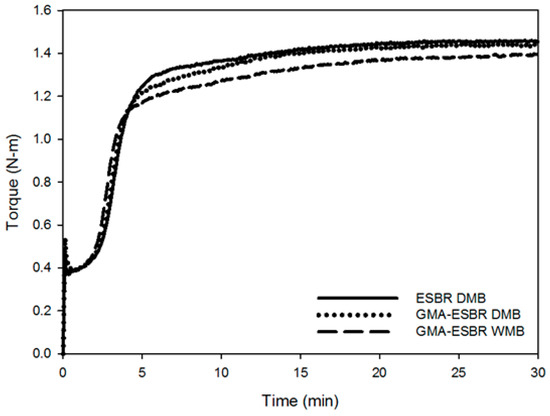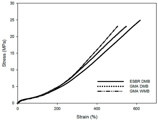 The cure characteristics of the ESBR DMB, GMA-ESBR DMB, and GMA-ESBR WMB compounds are shown in Figure 4. The Tmax value of GMA-ESBR compounds were confirmed to be low. In general, the Tmax value is strongly influenced by the crosslink density [13] and filler dispersion in the compound [14]. For the GMA-ESBR compound, the bond strength between the filler and rubber is stronger than that of the ESBR compound. Thus, the agglomerate size should be decreased, i.e., dispersion should be improved. Also, the torque value of GMA-ESBR WMB is lower than that of GMA-ESBR DMB. This is because the silica dispersion of GMA-ESBR WMB is better and processability is improved. Therefore, the WMB technology improves the processability problem of GMA-ESBR. The results of crosslink density measurement are shown in Table 7 together with the evaluation results of the cure characteristics. The results confirmed that the crosslink densities of the GMA-ESBR compounds were higher than that of the ESBR compound. Although the crosslinking densities of the GMA-ESBR compounds are higher than that of the ESBR DMB compound, it can be confirmed that the GMA-ESBR compounds were more dispersed than the ESBR compound because their Tmax values are smaller. In addition, the crosslink densities of the GMA-ESBR DMB and WMB compounds are significantly different. In the early stage of the GMA-ESBR DMB manufacturing process, only the GMA-ESBR was put into the mixer and a gel was formed by the temperature during the initial mixing stage; it is expected that the V1 value was increased in the analysis of the crosslinked structure by the gel formation. This can be confirmed in the subsequent evaluation of mechanical properties.