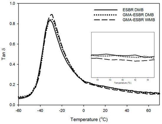 Viscoelastic properties of ESBR DMB, GMA-ESBR DMB, and GMA-ESBR WMB compounds.
