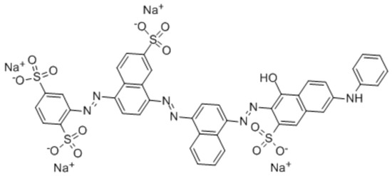 The adsorption capacity out of the polymers was tested using Direct Blue 78 dye as a model compound. DB78 is an azo dye (CAS 2503-73-3) whose molecular weight is 1055.91 g/mol and its formula is C42H25N7Na4O13S4 (Figure 1). Dye concentrations of 25, 50, 100, 150, 200, 250 and 300 mg/L were used to evaluate the adsorption capacity of the different polymers.