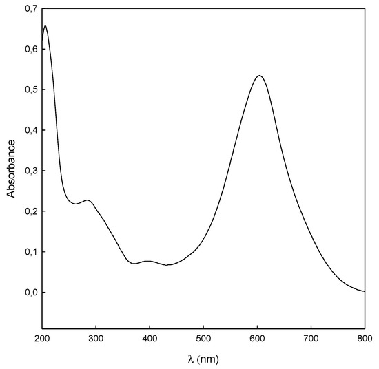 The concentration of dye was analyzed at the maximum absorbance of the dye, 612 nm (Figure 2), using a spectrophotometer (Shimadzu UV-1603, Shimadzu Europe GmbH, Duisburg, Germany), measuring the absorbance before and after the treatment.