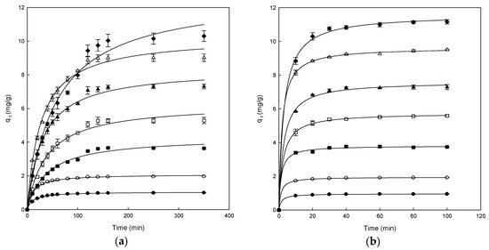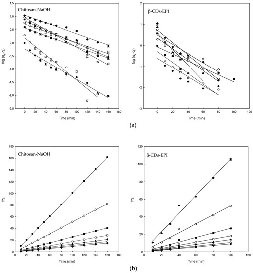 The fitting of experimental data to the pseudo-first-order plots for the adsorption of Direct Blue on different polymers are shown in Figure 4a and the corresponding parameters in Table 2. The goodness of fit of this model was expressed using the linear determination coefficient (R2). The linearity of the model (log (qe − qt) versus t) was plotted for 350 min of contact in the case of the chitosan-NaOH polymer and 100 min for the β-CDs-EPI polymer. The R2 values for chitosan-NaOH ranged from 0.934 to 0.986 and between 0.736 and 0.938 for β-CDs-EPI. Theoretical values of qe were compared with the experimental data. Despite the fact that some values were relatively high, the obtained R2 value revealed the poor fit to the model. Because of these results, it was appropriate to study the pseudo-second-order model with the experimental data obtained.