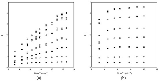 The intraparticle diffusion model plots for the Direct Blue 78 adsorption onto chitosan-NaOH (a) and β-CDs-EPI (b) polymers at different dye concentrations (25 mg/L (●), 50 mg/L (○), 100 mg/L (■), 150 mg/L (□), 200 mg/L (▲), 250 mg/L (Δ) and 300 mg/L (♦)).