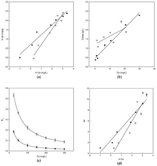 The Langmuir isotherm model considers that the adsorption process happens onto a surface containing a finite number of identical sites. This model is probably the most known adsorption isotherm and is extensively used for the adsorption of a pollutant from a liquid solution. The linearized form of the model is given by Equation (9) [22,26]: