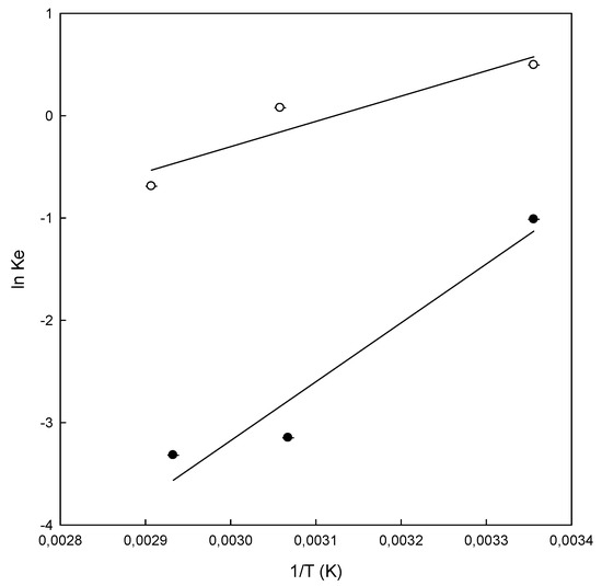 Van’t Hoff plot for the adsorption of Direct Blue 78 onto chitosan-NaOH (●) and β-CDs-EPI (○) polymers at different temperatures. Ke is the equilibrium constant and T the temperature.