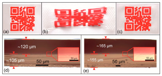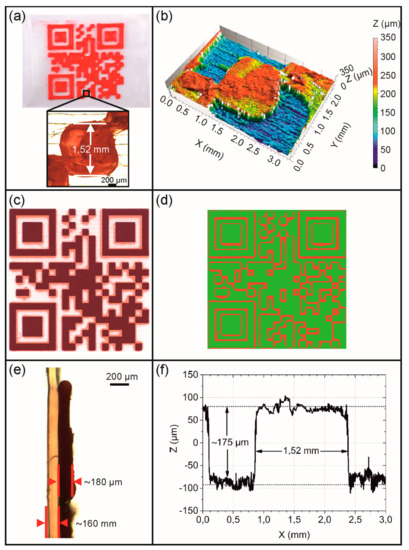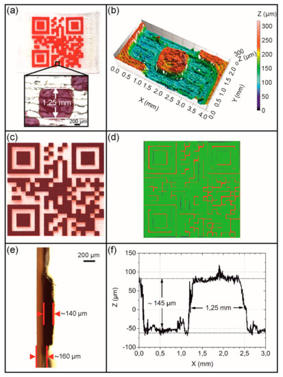 - Type 2: In analogy to the type 1 QR code carrier, the substrate was printed with non-dyed PEU using a 400 µm nozzle. Again, a target layer thickness of 180 µm was selected for the substrate, but the elevation was built with red PEU employing a 400 µm nozzle.