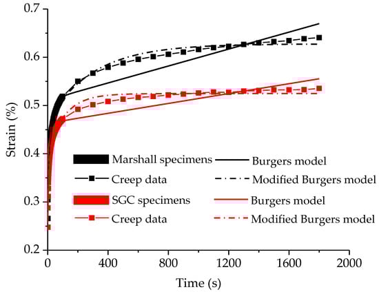 Figure 11 shows the creep curves of Marshall and SGC specimens. Obviously, there is a clear difference between the two curves of Marshall and SGC specimens. A higher creep strain generally implies a poorer deformation resistance. Thus, it could be considered that the Superpave gyratory method can improve the deformation resistance in contrast to the Marshall compaction method. Besides, the creep result of these two specimens are further analyzed by using Burgers model and modified Burgers model. The Burgers model (as plotted in Figure 12) is a series combination of Maxwell and Kelvin models, indicating elastic and viscoelastic deformation, viscous flow, and so on [40,41].