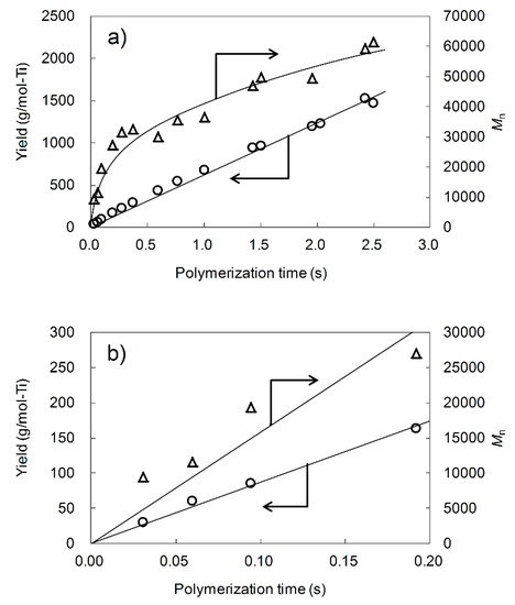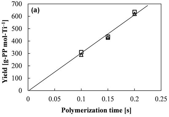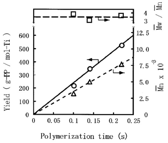 38], which made it possible to perform adequate characterizations even for the polymers obtained in ultra-short-time (<0.1 s) polymerization. Most importantly, the expansion in the accessible range of the polymerization time from a few tens of milliseconds to several seconds, the LSF technique has made it feasible to understand the chemical and physical transformations of a ZN catalyst occurring at the early stage of the polymerization [
