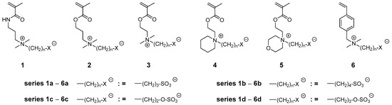 Examples of zwitterionic methacrylic and styrenic sulfobetaine (series a–b) and sulfabetaine (series c–d) monomers studied: Series a = 3-ammonio propanesulfonates, series b = 4-ammonio butanesulfonates, series c = 2-ammonio ethylsulfates, and series d = 3-ammonio propylsulfates.
