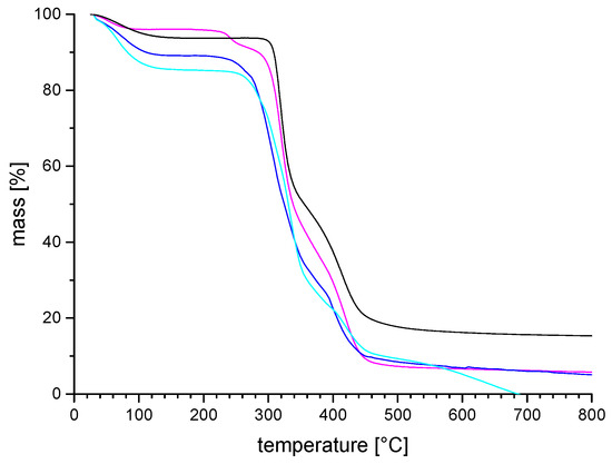 Exemplary TGA thermograms of zwitterionic polymer series P-4: (−−−) = P-4a; (−−−) = P-4b; (−−−) = P-4c; (−−−) = P-4d.