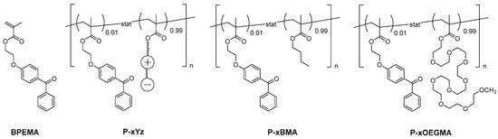Chemical structure of the photo-reactive comonomer BPEMA used, the photo-crosslinkable copolymers P–xYz (with Y = 1−6 and z = a−d; see also Figure 1), and of the reference copolymer systems P–xBMA and P–xOEGMA.