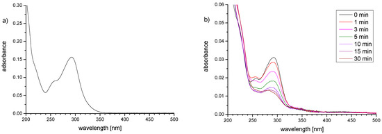 (a) UV-Vis spectra of photo-reactive monomer BPEMA in TFE solution (0.01 mM); (b) UV-Vis spectra of hydrogel films of P−x3a (P−xSPE) on a quartz support as function of the exposure-time to UV-irradiation (from top to bottom: 0, 1, 3,5, 10, 15, and 30 min).