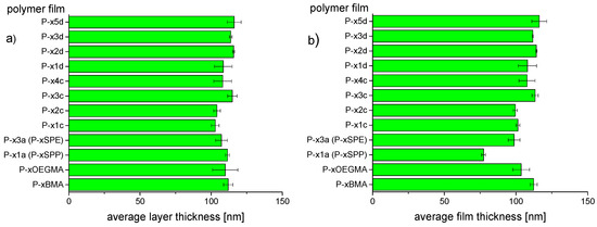 The conditions for spin-coating were slightly adapted for each polymer to obtain consistently film thicknesses of about 100 nm (Figure 5). This value appeared a reasonable choice, as very thin hydrogel coatings (<30 nm) seem prone to enhanced fouling [74,75]. Still, reports are somewhat conflicting with respect to the existence and range of an optimal thickness of thin hydrogel films for reducing protein fouling [76,77,78,79,80,81]. Hence in prior exploratory experiments with reference copolymer P−x3a (P−xSPE), we clarified that protein adsorption increased notably when the thickness of hydrogel films dropped below 80 nm, whereas the adsorbed amounts were about the same for thicknesses up to 120 nm at least (vide infra, see also Figure 7a below).